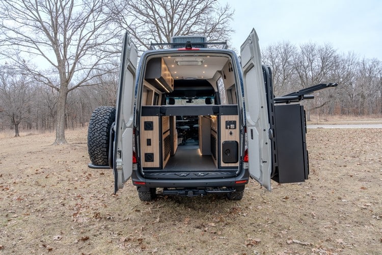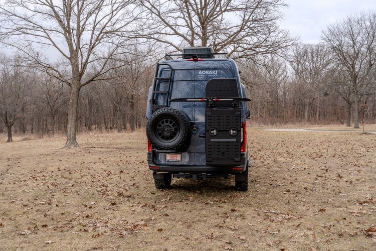 Owl Vans rear door system: ladder, expedition box, and 1 Up USA 2-bike carrier