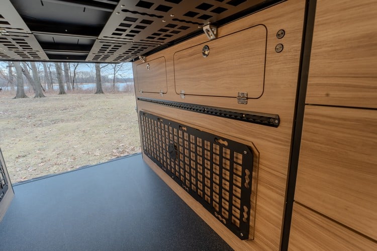 Owl Vans rear door system: ladder, monster expedition box, and 1 Up USA bike carrier
